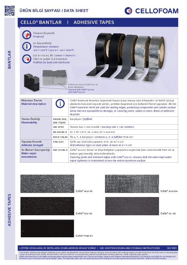 Cello® Bantlar, çeşitli yüzey seçeneklerine sahiptir(PU,ALG,VLC), esas malzemenin kenarlarının ve köşelerinin kapatılmasında, izole edilmesinde, eklem yerlerinde ve çatlakların kapatılmasında kullanılır.Mükemmel yapışma özelliğine sahiptir.Ürün ayrıntıları