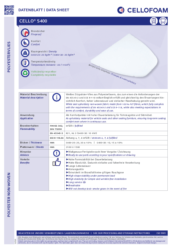 Cello® S400, %100 PET elyaftan üretilmiş beyaz bir koltuk döşeme keçesidir. EN 45545-2 ve ECE R-118 standartlarının tüm gerekliliklerini tam olarak karşılarken, aynı zamanda konfor, uzun ömür ve kolay kullanım beklentilerini de karşılar.Ürün ayrıntıları