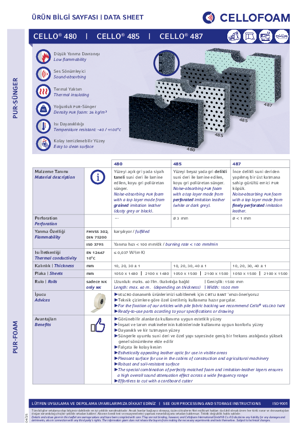 İnce delikli suni deri yüzeye sahip PUR sünger. Cello® 487, göze hitap eden yapısının yanında, aynı zamanda dayanıklı ve temizlenmesi de kolay olan bir üründür.