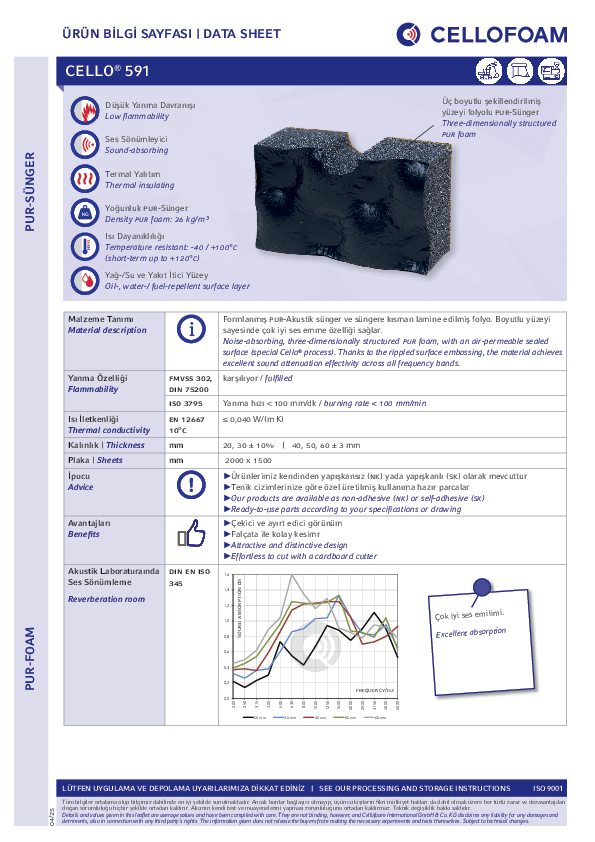 Viyol formlu yüzeyi ince bir folyo(siyah) ile lamine edilen Poliüretan bir süngerdir. Cello® 591, yağ, su ve yakıt geçirmeyen yüzeyi sayesinde problemsizce silinebilir.Ürün ayrıntıları