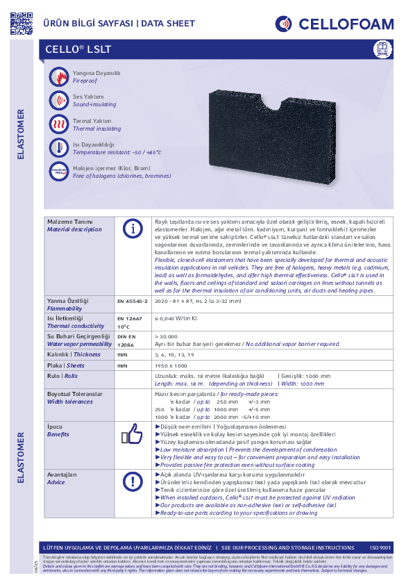 Özellikle raylı sitemlerin ısı ve akustik yalıtım gereken alanlarında kullanılmak üzere, esnek, kapalı hücreli ve elastomer olarak üretilmiştir. Halojen içermez (örn. Klor, Brom), ağır metal (örn. Kadmiyum, Kurşun) ayrıca formaldehit ve yüksek ısıl verim mevcuttur.Ürün ayrıntıları